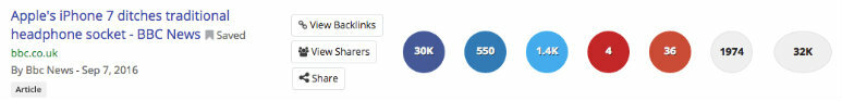 Below is an example from the BBC about Apple dropping the traditional headphone socket on the iPhone 7. The article received 32,000 shares which is outside of the top hundred most shared articles for that site but nearly 2,000 domains linked to the article, making it one of the top BBC articles for links.