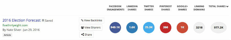 As we saw above, political posts, particularly controversial posts, can achieve very high levels of shares and links. Original political research is another particular niche that also gets a lot of domain links. We can see this with the research conducted by Five Thirty Eight and in particular their election forecast. This particular content, which is regularly updated, has more domain links than any of the other examples we have used in this article. Why? It’s often controversial, taps into a trend many are obsessed with, it’s political, authoritative, provides insights, and is data-driven research. Close to a full house on the magic boxes. And that’s how you get 1m shares and over 3,000 links.