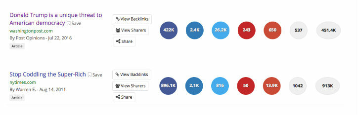 This was a surprise to us. We knew that political articles get very well shared by the relevant ‘tribe’ but we did not expect so many to get referenced and linked. Below are two examples of opinion pieces that got both shares and links. These may not seem like high numbers of referring domain links but it is actually rare for content from sites such as the Washington Post or even the New York Times to get more than 500 referring domain links to articles, despite the size of their audiences and numbers of shares.