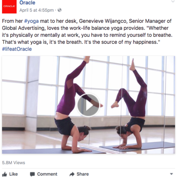 But, even without semi-professional yoga instructors and video crews, employee stories can get a lot of interactions. This video, also from Oracle, features Bruno Borges, principal product manager, with his nine golden retriever puppies. It also proves that puppies have a place on B2B Facebook pages. The Facebook clip is just 30 seconds long.