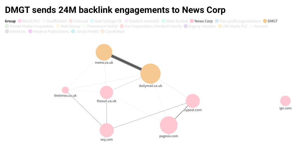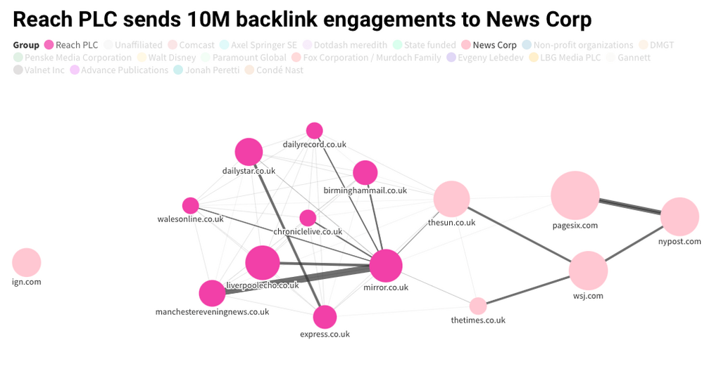 When you look purely at the number of links a family-owned publication earns, Reach PLC (Mirror, Daily Star etc.) takes top spot, racking up 670K backlinks in total across its own network.