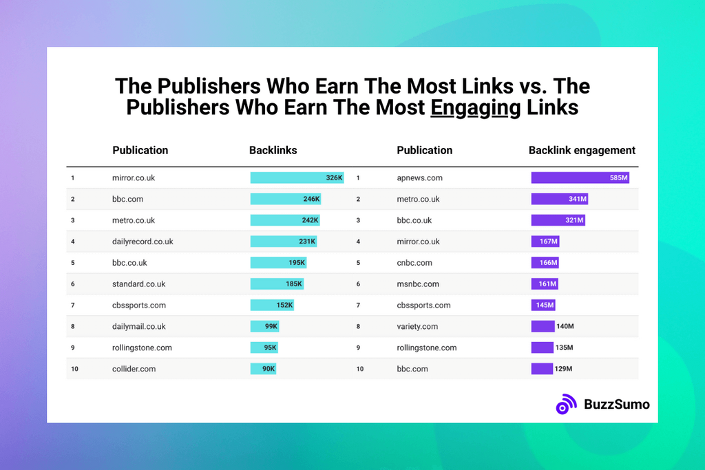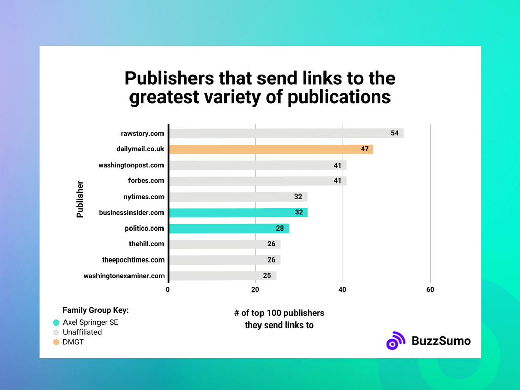 We analyzed the top 100 most engaging publications. For each individual publication, we discovered their top 10 backlinkers. But these top 10 backlinkers were picked from the same pool of publications (ie. the top 100), so that we focused on links from only the highest authority publications.