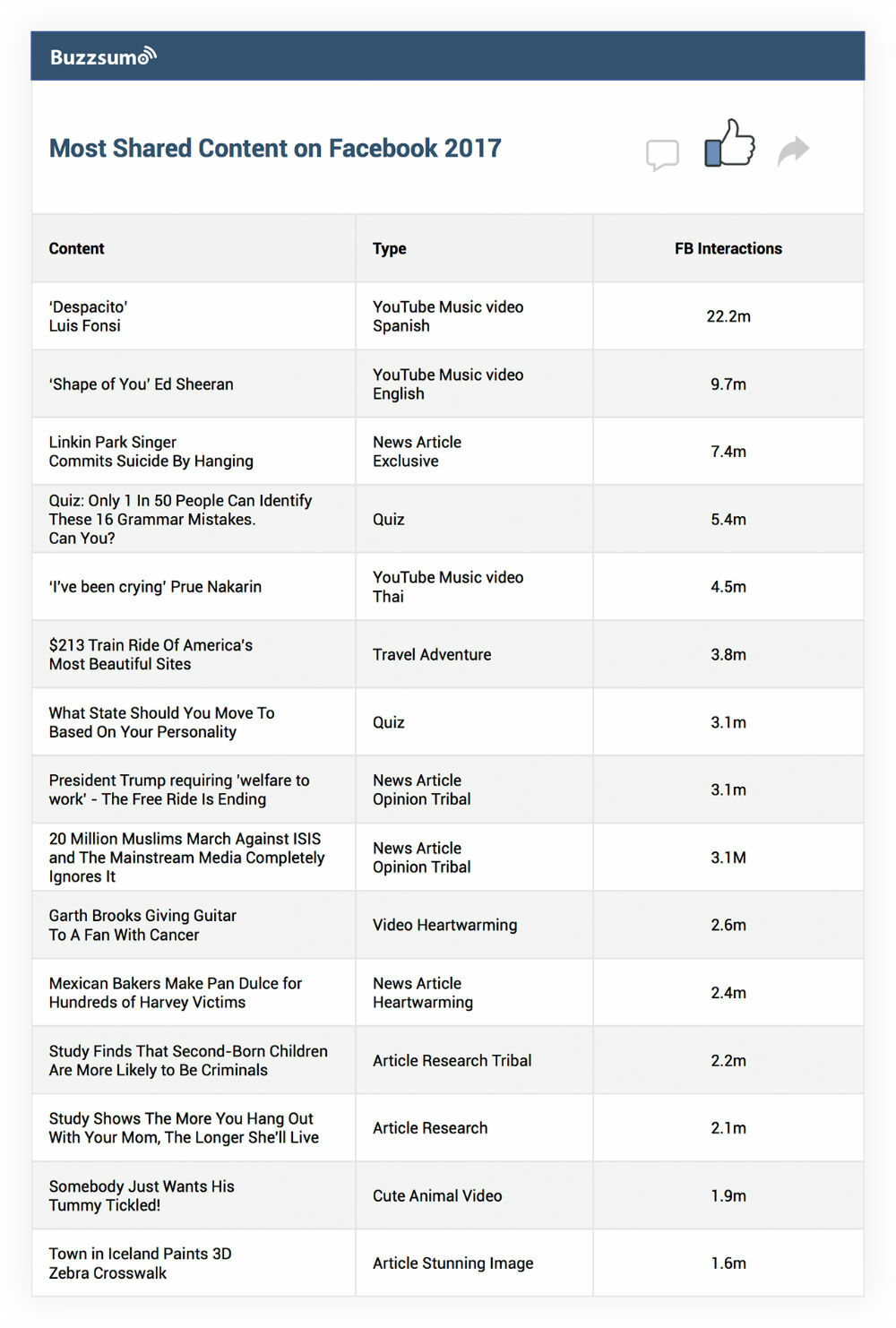 As we can see below Facebook audiences readily share entertaining, inspiring and heart-warming content published outside the platform. Music videos topped the charts this year with three of the top ten posts. We can also observe a strong tribal element when it comes to the sharing of political and opinion content. There were two political posts in the top ten.