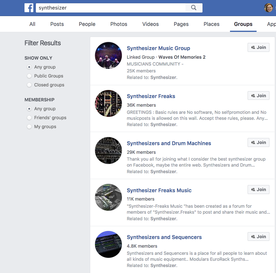 Begin by looking to see what groups already exist in your content area. Search Facebook and select “Groups” to filter results.