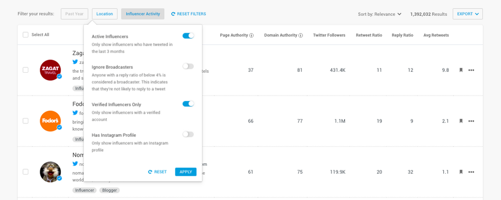 Buzzsumo’s Influencers tool helps in the discovery of influencers interested in your topic area. From there, select “Active Influencers only” and “Verified Influencers only” to exclude bloggers and non-verified accounts, focusing your research on major reporters and online writers.