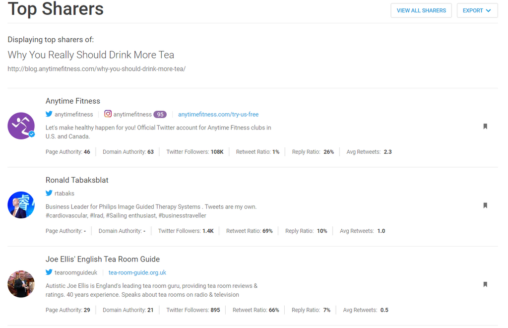 We could dig up one of our best performing blog posts about tea and plug it into the Buzzsumo backlink analysis tool like so: