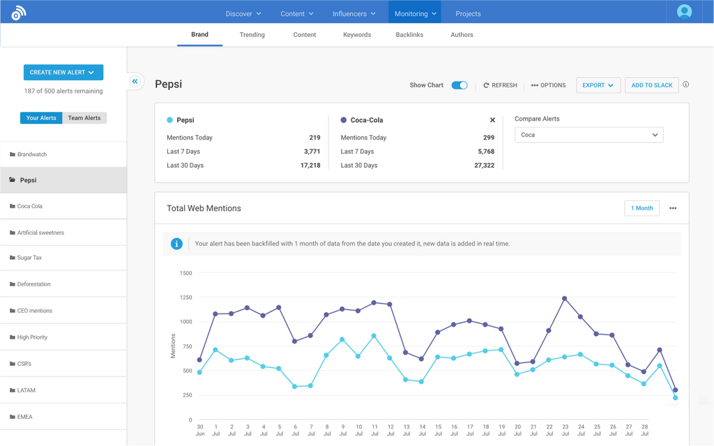 BuzzSumo monitors your competitors, brand mentions and industry updates. Alerts ensure you catch important events and don’t get smushed under the social media avalanche.