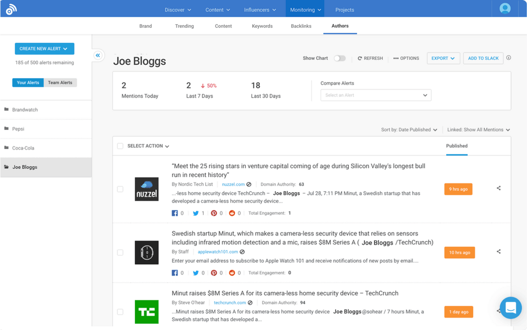 Create alerts for key influencers, bloggers and journalists so you can be first to engage with their content.
