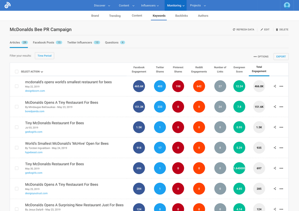 With BuzzSumo you can also tag your campaign articles to share them with clients and colleagues, complete with aggregated metrics to showcase your success.